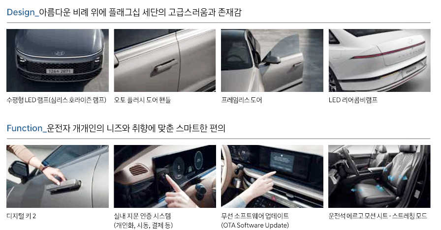 내부 시트는 모두 천연 가죽 소재로 이루어져 있고요. 1열의 통풍 시트와 운전석 에르고모션 시트로 최고급 사양이 적용되어 있습니다. 또한 디지털키 2 기본 적용이 되어 있고 스마트 파워트렁크, 실내 지문인증 시스템 등이 내장되어 있습니다.