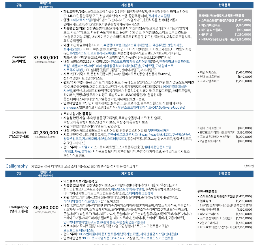 그랜저 가격표 2024년은 프리미엄, 익스클루시브, 캘리그래피 이렇게 3가지로 나누어서 구분을 지어볼 수가 있습니다. 가격은 프리미엄 3743만 원, 익스클루시브 4233만 원, 캘리그래피 4638만 원 이렇게 책정이 되고 있습니다.