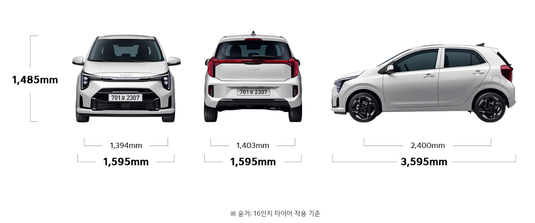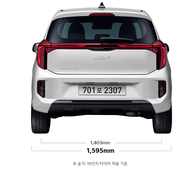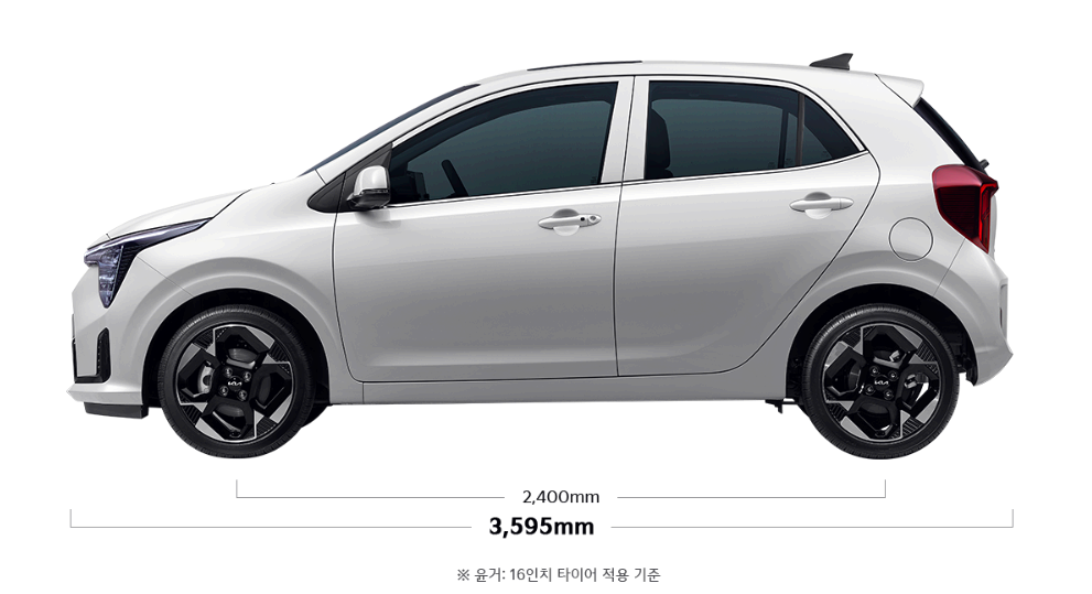 역동적이고 아이코닉한 측면부 디자인을 가지고 있는데요. 전면부 스타맵 시그니처 라이팅에서 후면부 시그니처 리어 콤비램프까지 연결된 캐릭터 라인으로 역동성을 더하고 서로 다른 도형들이 기하학적으로 조화를 이루는 16인치 휠로 모닝만의 개성 있는 이미지를 구현했습니다.