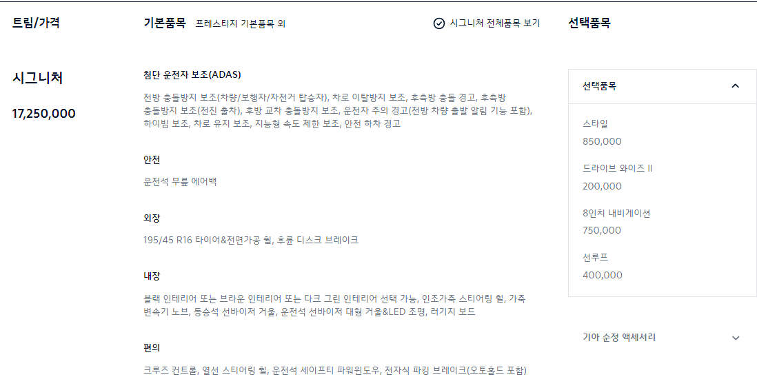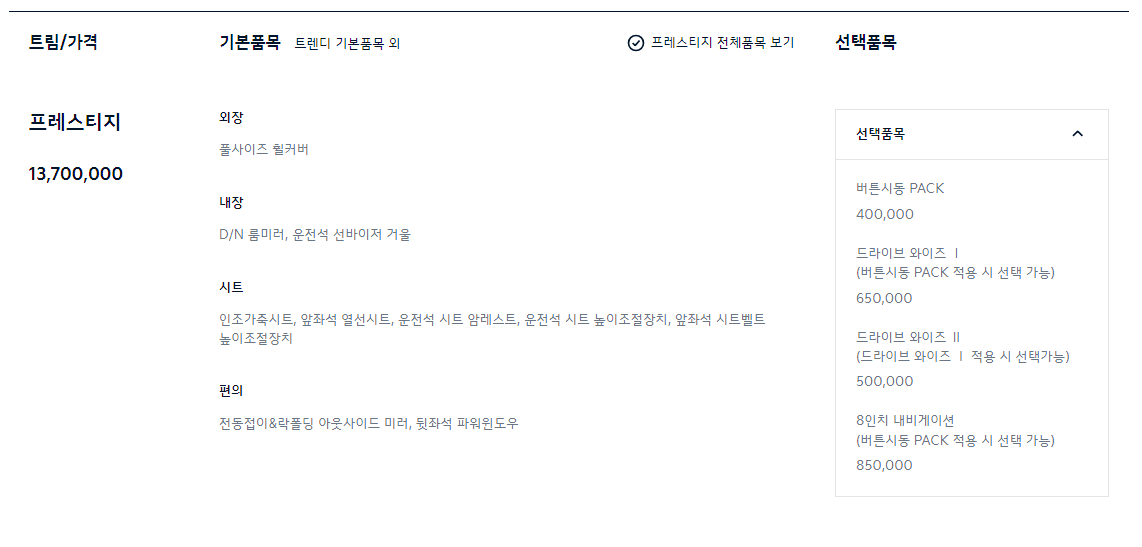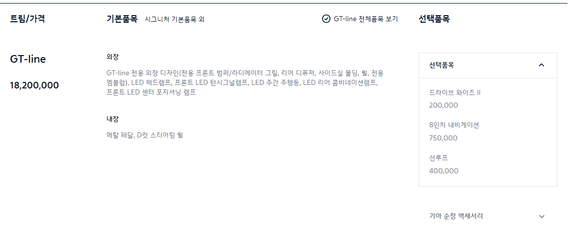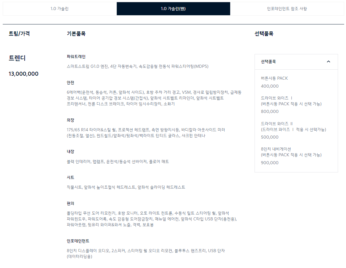 모닝 가격표 아래와 같이 트림에 따라서 4종으로 구성이 되어 있습니다. 트림은 트렌디, 프레스티지, 시그니처, GT라인 이렇게 구성이 되어 있습니다. 트렌디는 기본 1325만 원, 프레스티지는 1500만 원, 시그니처는 1725만 원, GT라인은 1820만 원으로 책정이 되어 있는 것을 보실 수 있습니다.