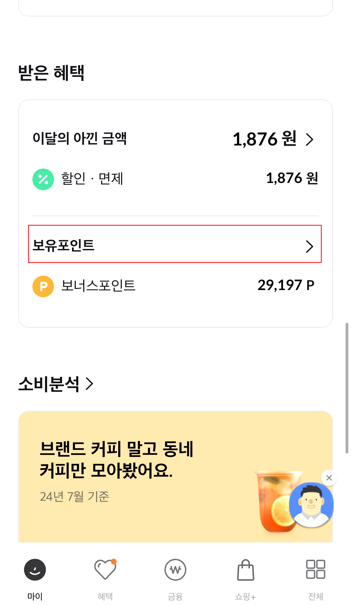 삼성카드 포인트 현금전환 방법 첫 번째로는 핸드폰 어플에서 삼성카드 어플을 열어줍니다. 메인 화면에서 밑으로 스크롤을 내리다 보면 받은 혜택에 보유포인트 - 보너스포인트를 보실 수 있습니다. 저의 경우에는 지금 현재 29,197원이 포인트로 적립이 되어 있는 상태입니다.
