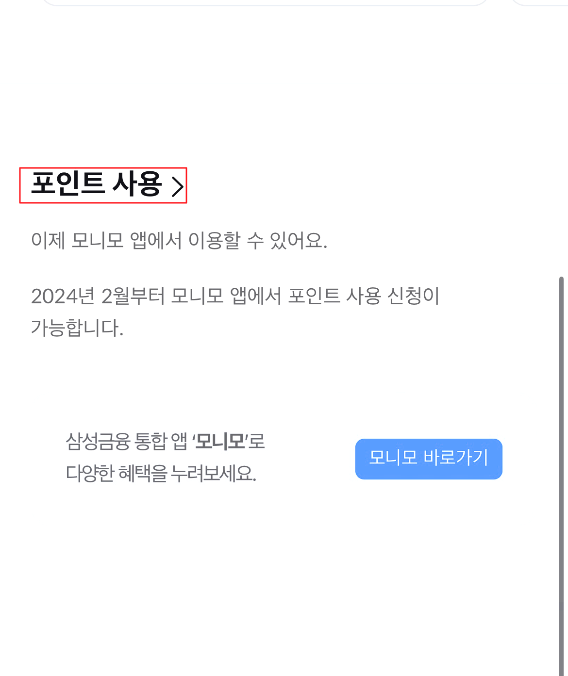 그런 다음, 스크롤을 가장 아래까지 내리면 가장 밑에 포인트 캐시백이 있습니다.