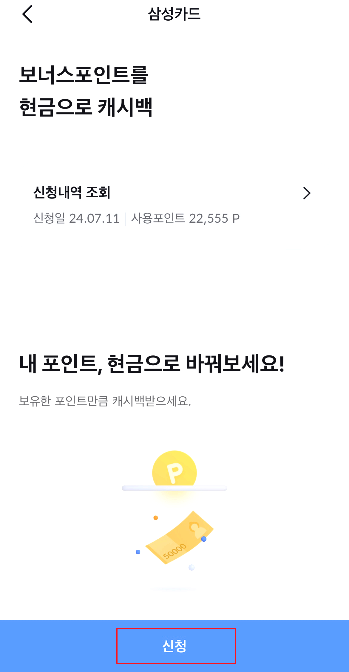 아래에서 신청을 누르고 입금계좌 입력하면 서비스 신청 가능시간인 오전 8시부터 저녁 8시까지 계좌에 삼성카드 포인트를 입금받으실 수 있습니다.