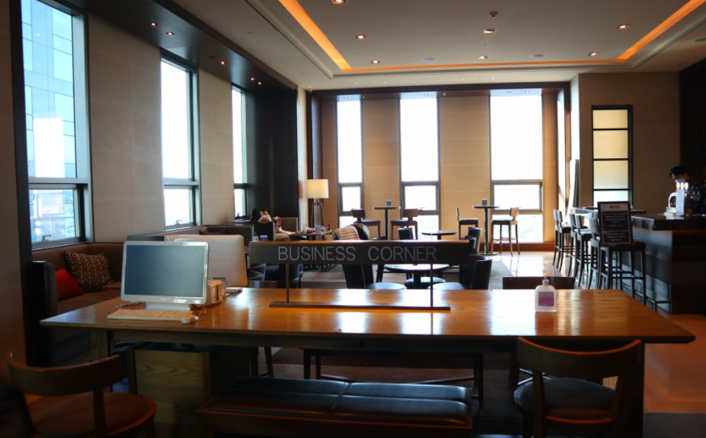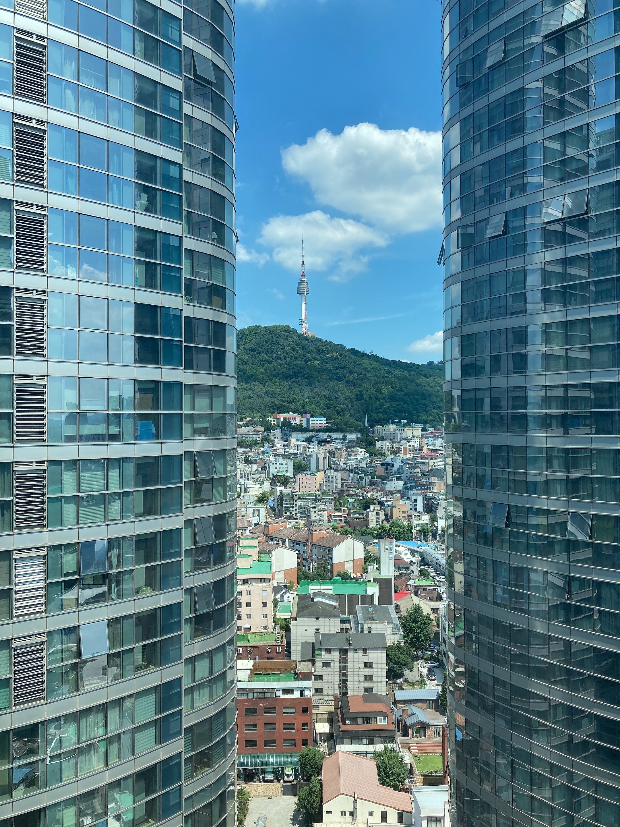남산도 가까이 있어서 건물 사이로 보이는 남산뷰도 너무 멋지더라고요. 체크인하는 곳은 19층인데, 기다리는 공간도 굉장히 클래식하게 꾸며져 있습니다. 최근에는 이곳에 스타벅스도 입점했다고 하네요.