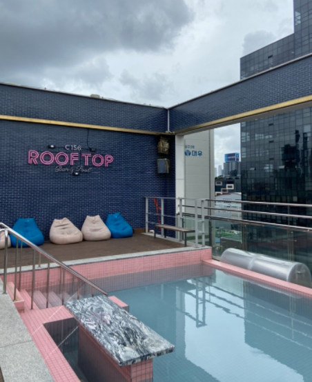 옥상에는 루프탑 온수풀 수영장이 있어서 수영도 즐기길 수 있습니다.