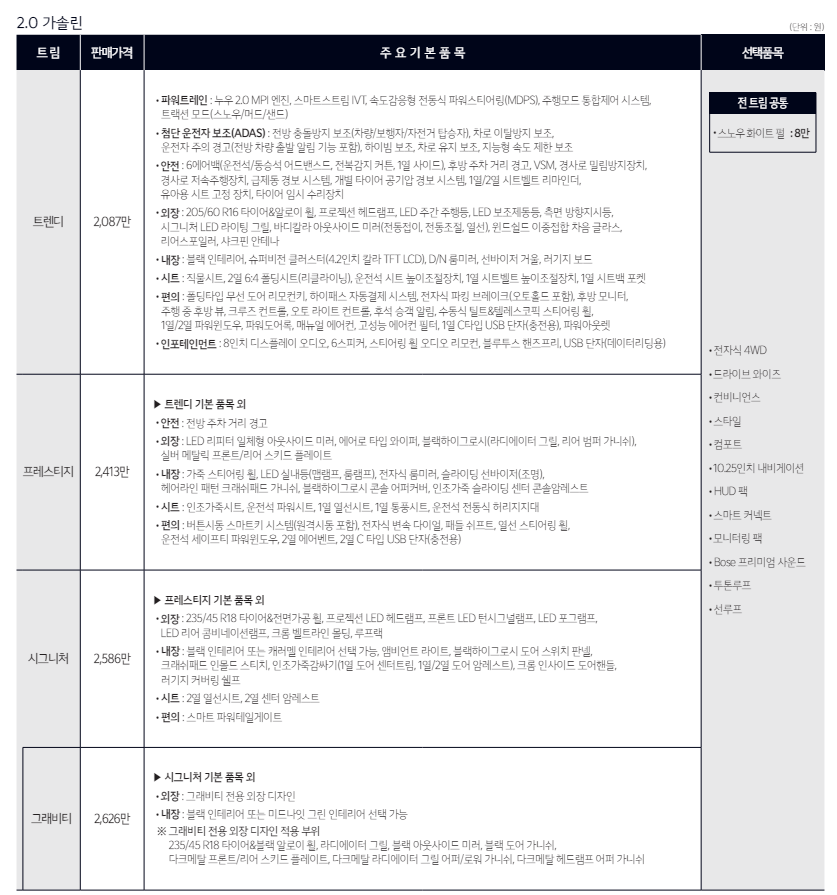 다음으로 셀토스 가격 가솔린 2.0 모델의 경우인데요. 여기서도 트렌디는 2087만 원에서 2265만 사이, 프레스티지는 2413만 원에서 2591만 원 사이, 시그니처는 2586만 원에서 2764만 원 사이, 마지막으로 그래비티는 2626만 원에서 2804만 원 사이라고 보시면 됩니다.