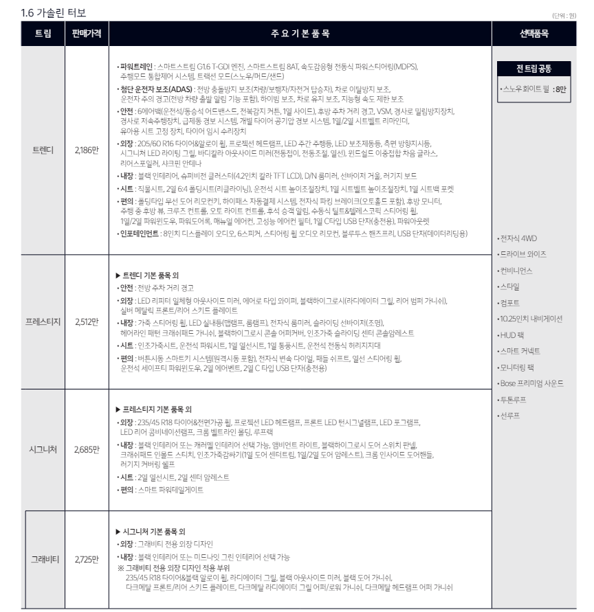 가솔린 터보 1.6의 세부모델로 트렌디 2WD와 4WD가 가격은 각각 2186만 원에서 2364만 원 사이입니다. 셀토스 가격 프레스티지 등 검은 2512만 원에서 2690만 원 사이, 시그니처는 2685만 원에서 2863만 원 사이 마지막으로 그래비티는 2725만 원에서 2903만 원 사이라고 보시면 됩니다.