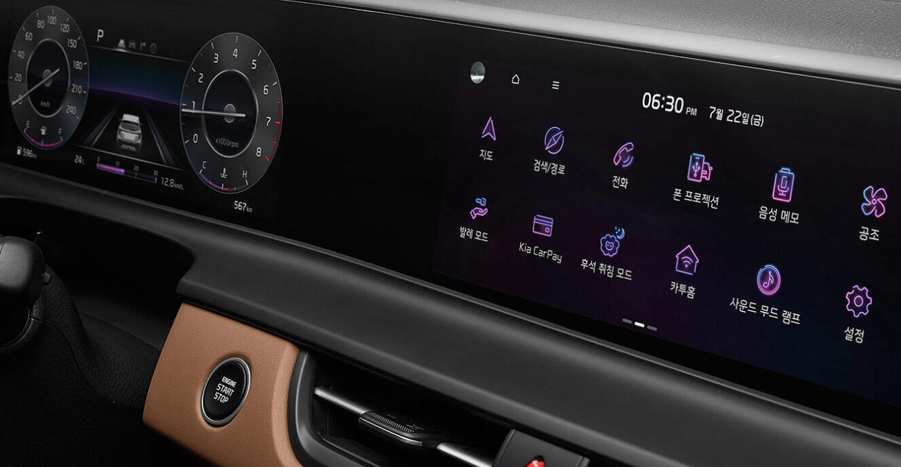 내부는 파노라마 디스플레이와 통합형 컨트롤러, 전자식 변속 다이얼, 앰비언트 라이트가 프리미엄 한 차내 경험을 제공하고 있습니다. 10. 25인치 클러스터와 10.25인치 내비게이션이 통합된 파노라마 디스플레이를 적용해 심플하고 하이테크 한 실내 인테리어를 구현했습니다.