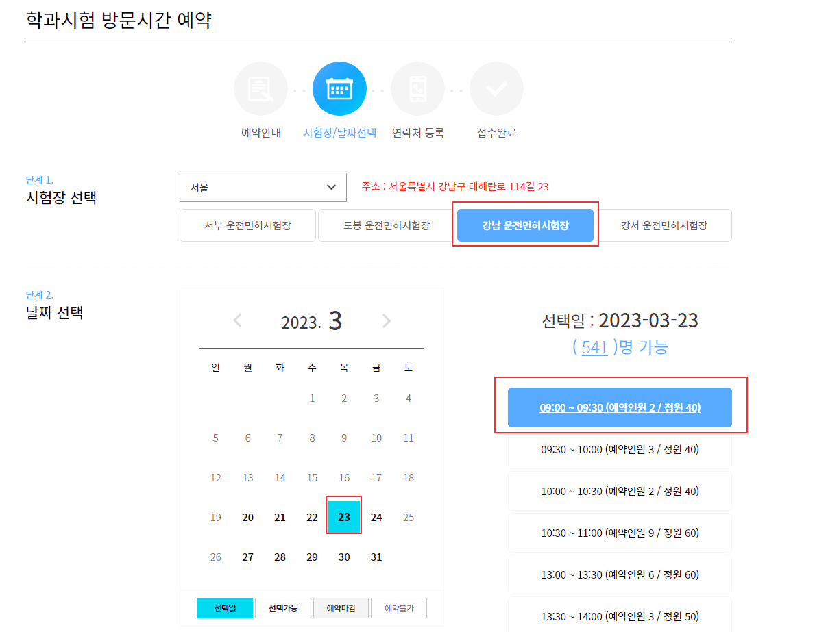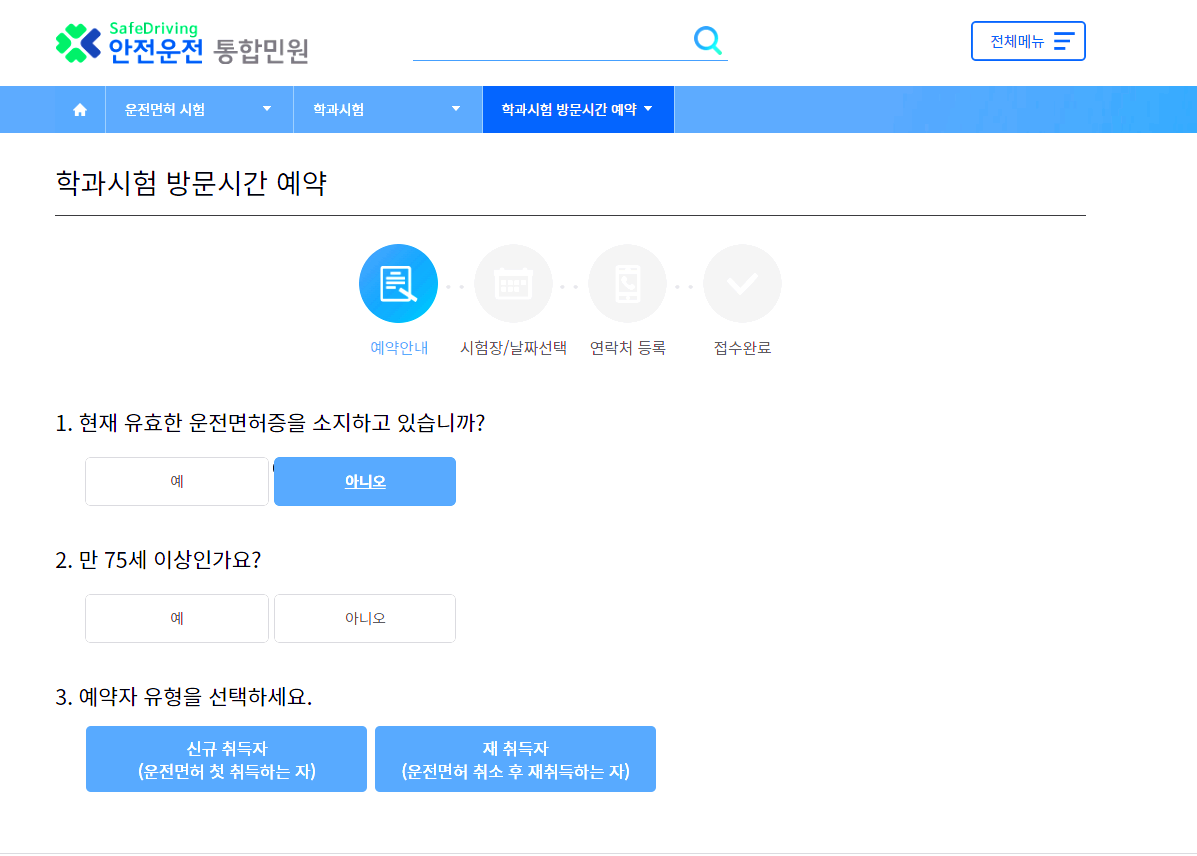 아래의 학과시험 방문시간 예약 부분에 정보를 입력하시고 다음으로 넘어가면 접수가 완료됩니다.