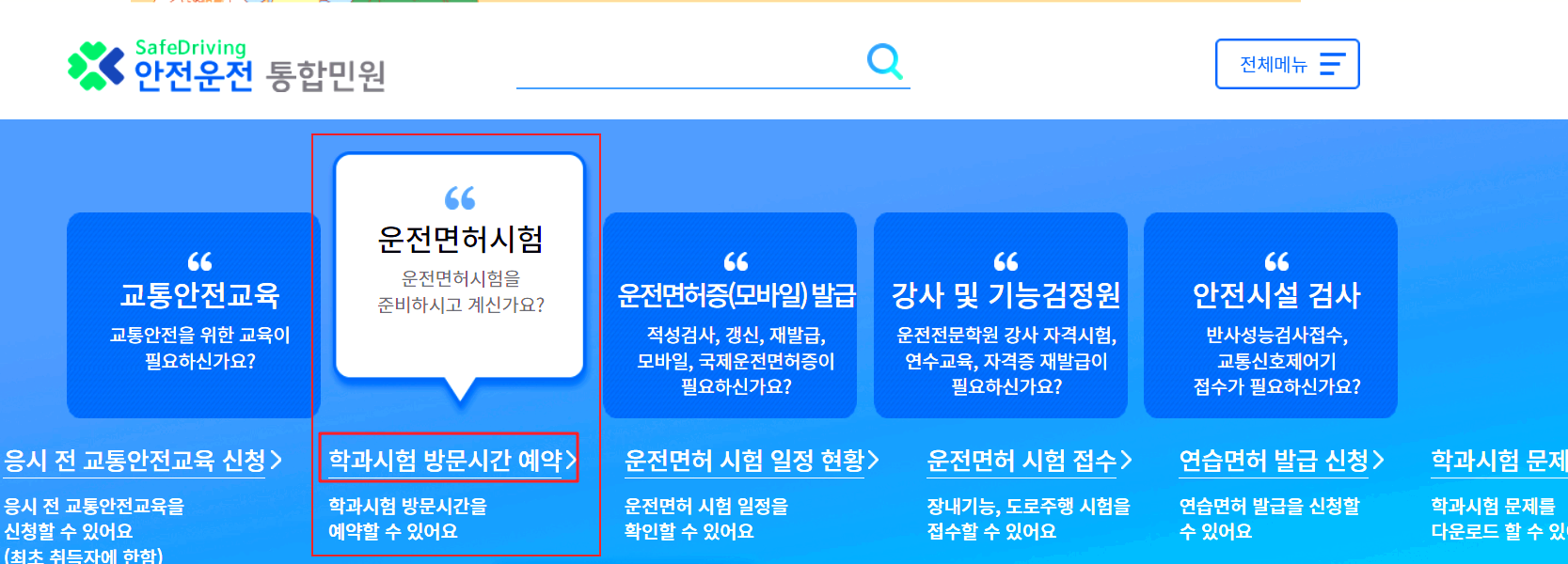 운전면허 필기시험 접수를 위해서는 안전운전 통합민원 사이트를 방문해 주세요. 아래와 같은 화면이 뜨는데 이 중에서 운전면허시험 - 학과시험 방문시간 예약을 클릭해 주세요.