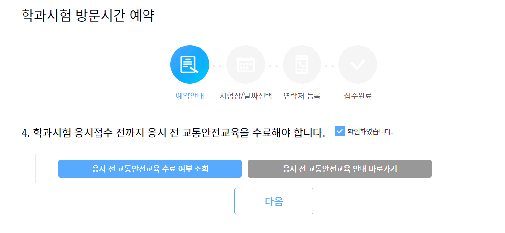 아래와 같이 필기시험 예약 전에는 교통안전교육 수료를 해야만 응시가 가능하기 때문에 먼저 진행을 해주셔야 합니다.