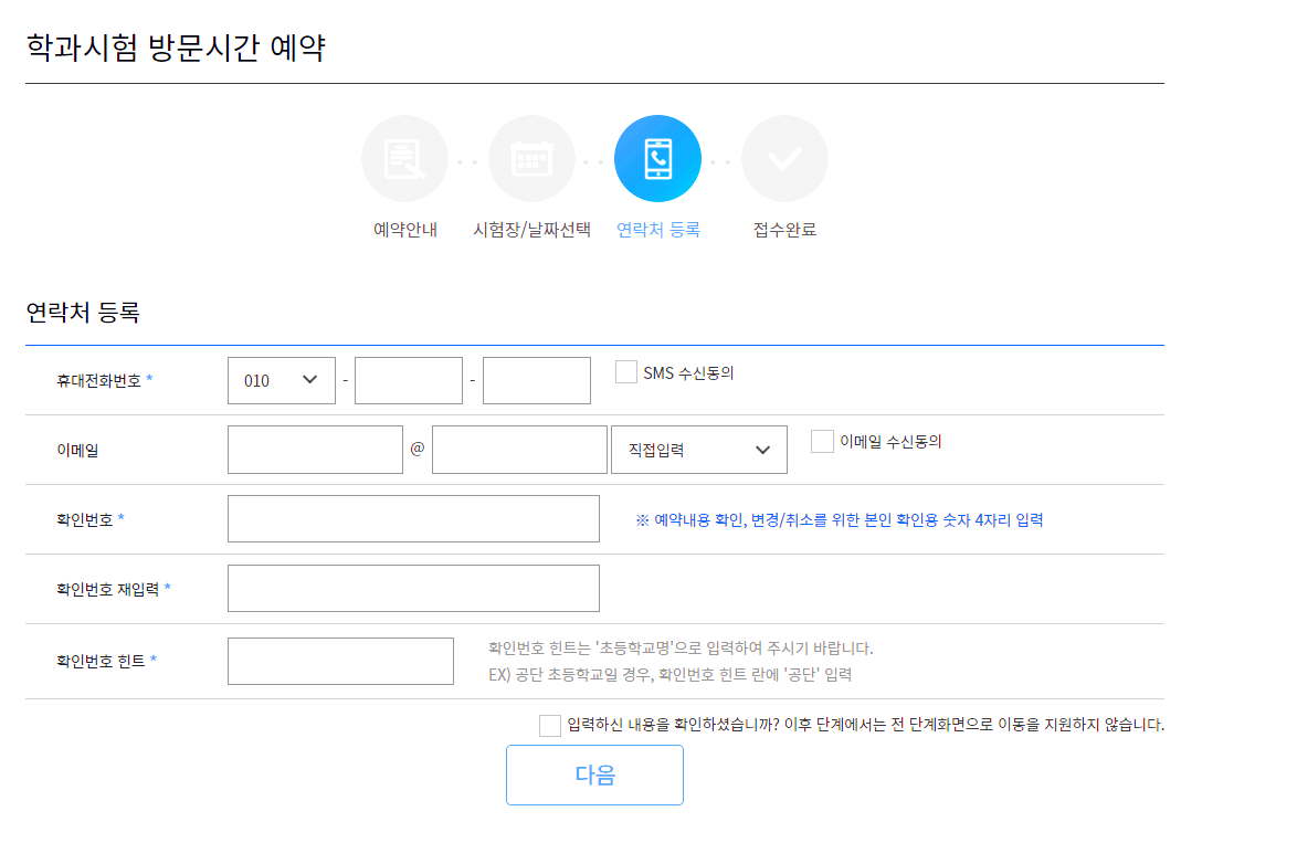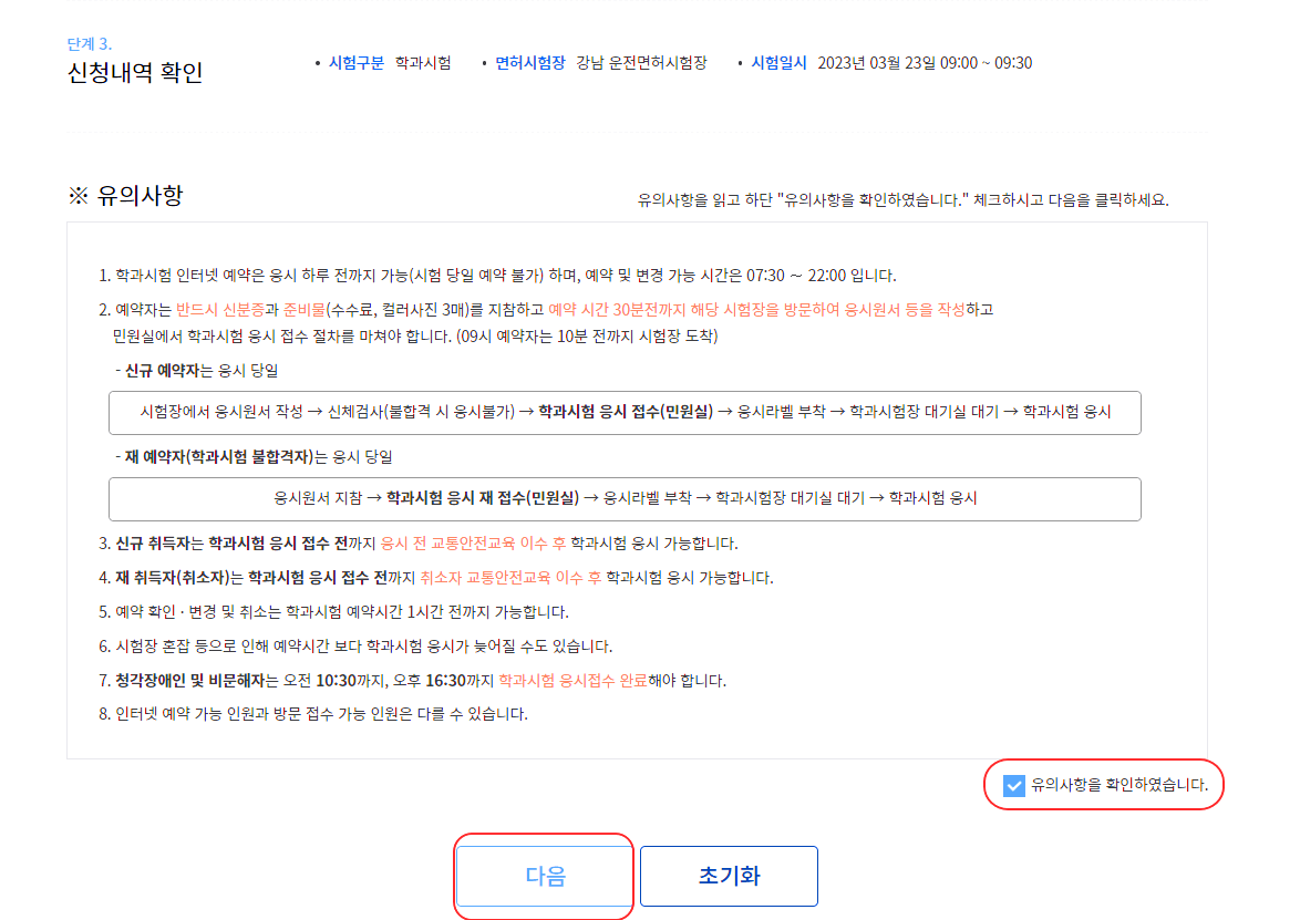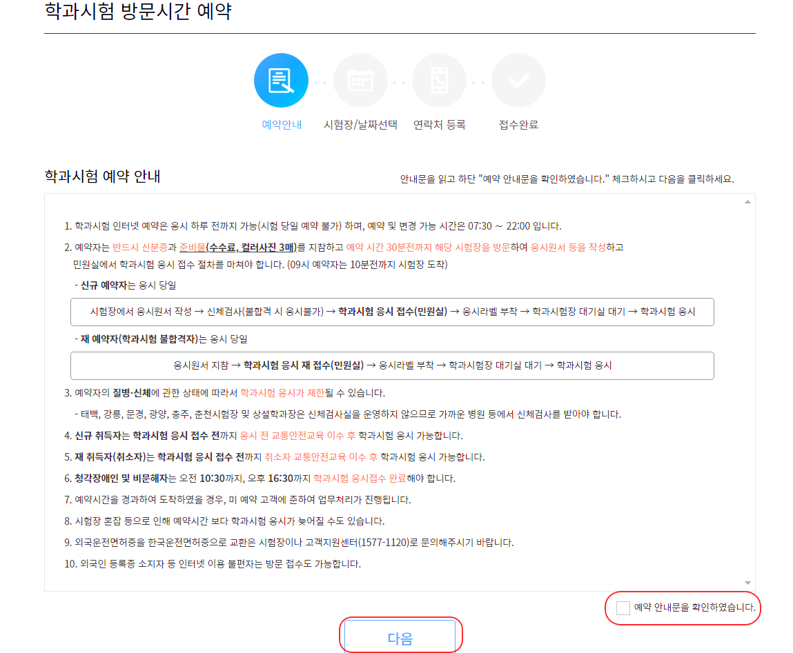 학과시험 방문시간 예약에 관련된 아래의 내용을 읽고 안내문을 확인하였습니다 이 부분에 체크를 하고 다음으로 넘어갑니다.