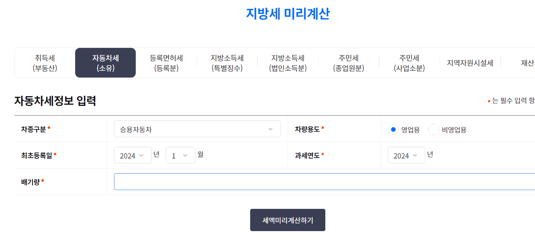 위택스 - 지방세 정보 - 지방세 미리 계산 - 자동차세(소유) 메뉴로 들어가시면 됩니다.