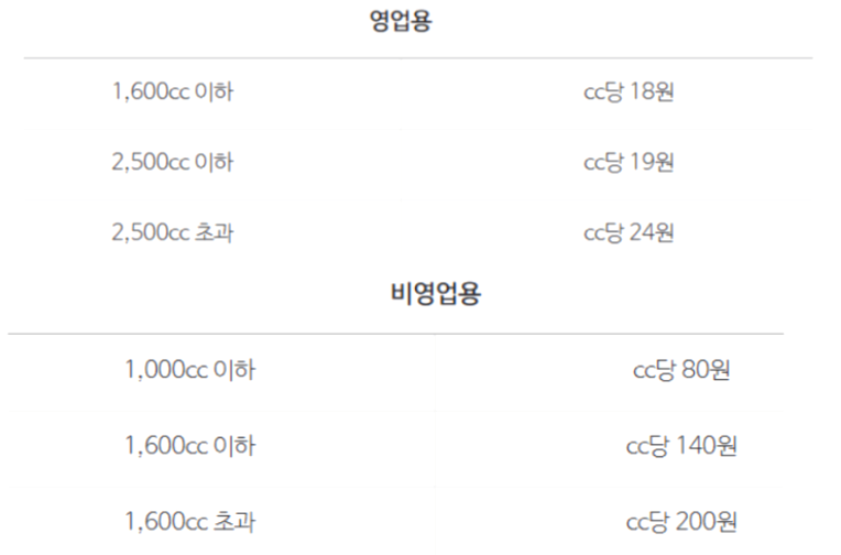 비영업용의 경우는 세액이 더 높습니다. 1000cc 이하는 80원, 1600cc 이하는 140원, 1600cc 초과는 200원입니다. 단, 친환경차는 영업용이 2만 원, 비영업용은 10만 원을 부과받게 됩니다.