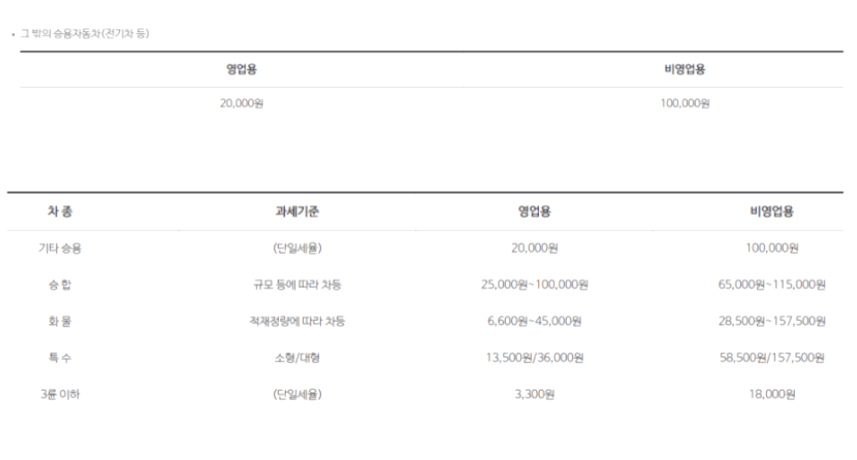 승용차가 아닌 그 밖의 자동차는 별도의 세율을 적용받습니다. 승합차, 화물차, 특수, 3륜 이하는 세금표에 따라서 납부하게 됩니다. 우리가 일반적으로 사용하는 승용차가 가장 많은 세금을 부과받는다고 보시면 됩니다.