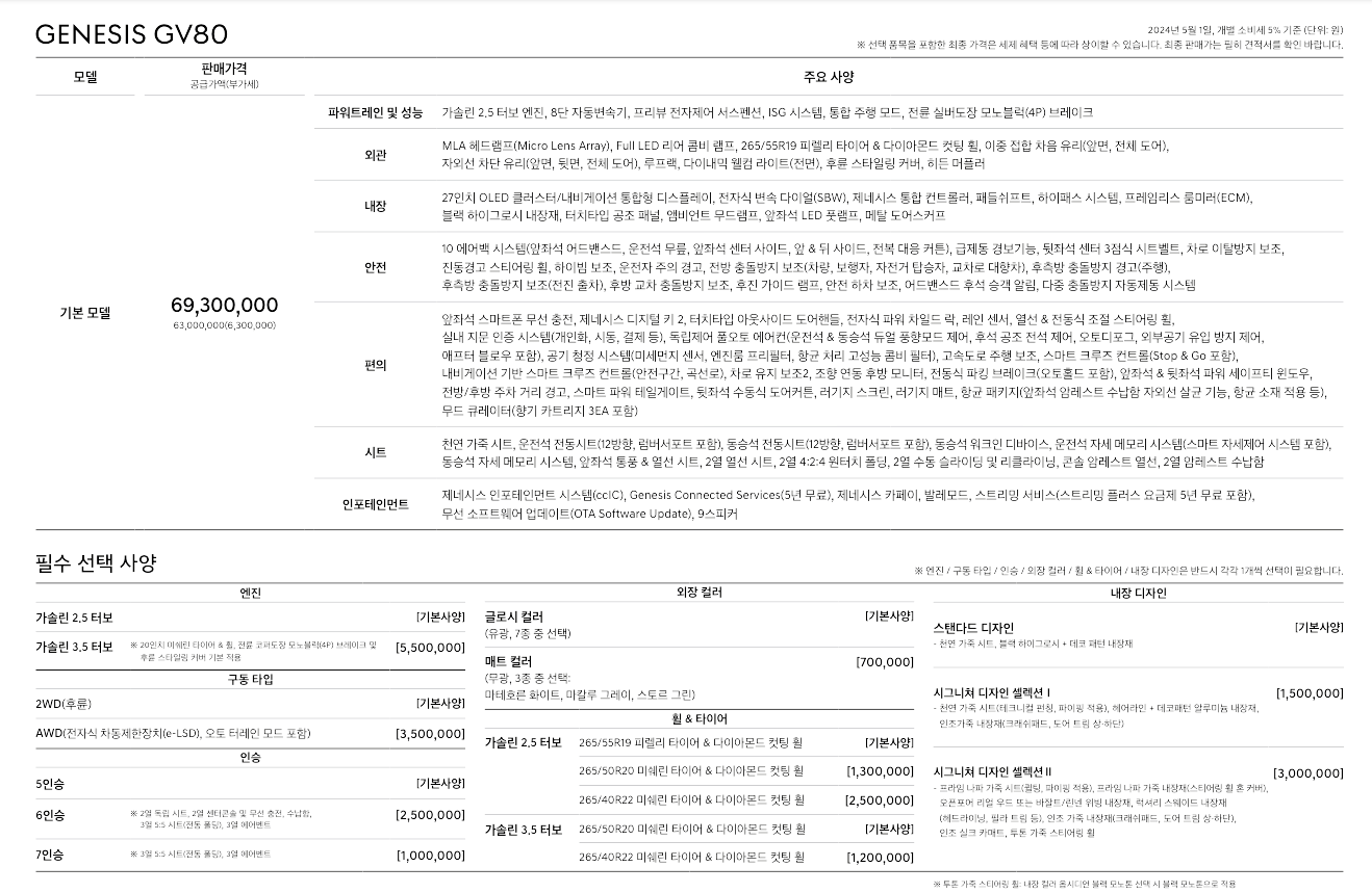3. 제네시스 gv80 3.5T 터보 2WD 모델은 기본 7,480만원입니다. 2.5T 터보 모델보다 풍부한 최대 출력과 토크를 제공해 강력한 주행 성능을 자랑하고 있습니다.