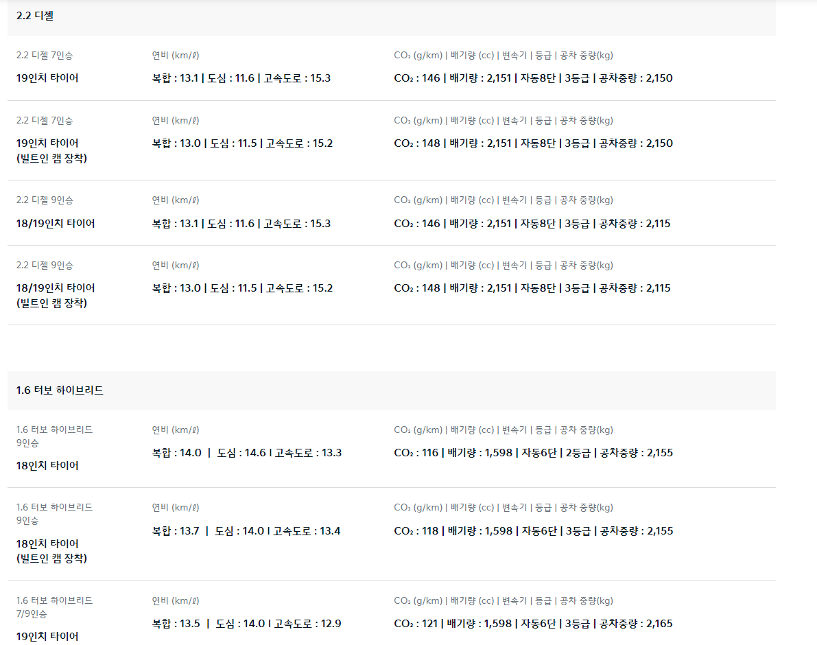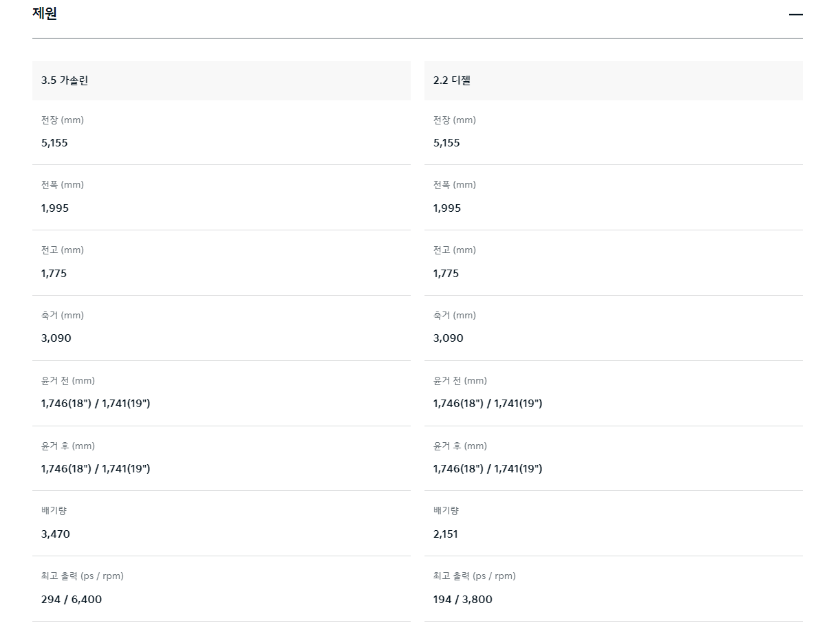 2.2리터 디젤 엔진은 202마력의 최대 출력과 44.1 kgf.m의 최대 토크를 발휘하며, 3.5리터 가솔린 엔진은 294마력 최대 출력과 36.5 kgf.m의 최대 토크를 발휘합니다. 2.2리터 디젤 하이브리드 엔진은 195마력의 최대 출력과 44.1 kgf.m의 최대 토크를 발휘하며, 전기 모터 도움으로 강력한 토크와 좋은 연비를 제공하고 있습니다.