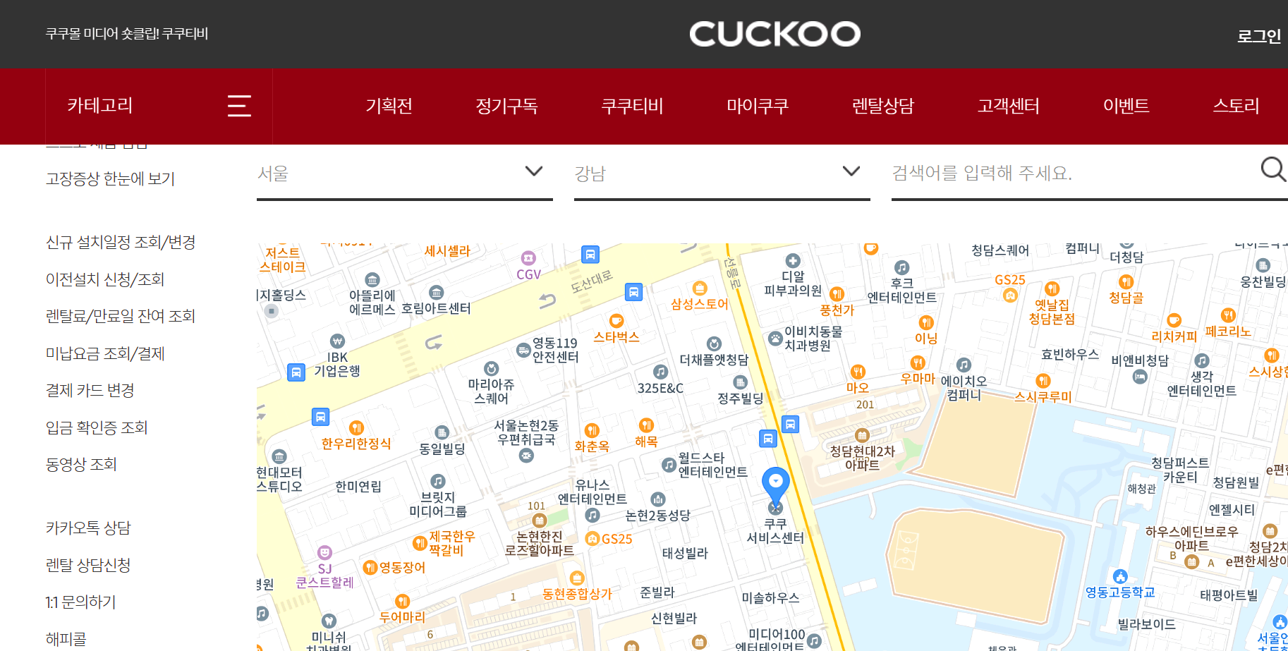 위의 화면이 보이시면 본인이 거주하는 시와 구 등을 입력하면 가장 가까운 쿠쿠정수기 서비스센터를 발견하실 수 있습니다.