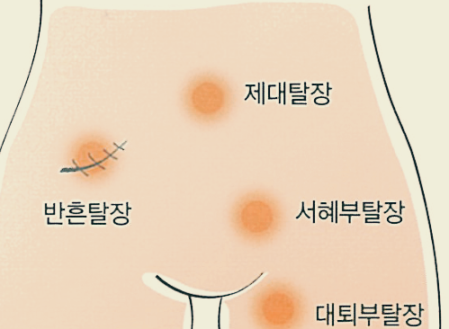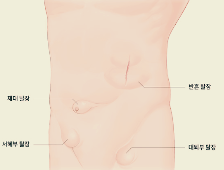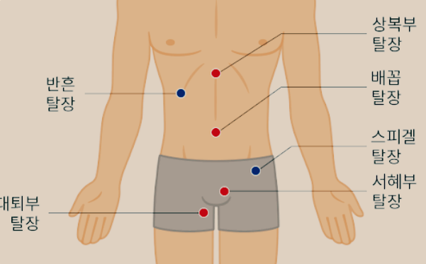 탈장이란 신체의 장기가 제자리에 있지 않고 다른 조직을 통해 돌출되거나 빠져나오는 증상을 말합니다. 신체 어느 곳에나 생길 수 있지만 대부분의 탈장은 복벽, 즉 배 안의 앞쪽의 벽에서 발생하는데, 복벽 탈장은 복강을 둘러싼 근육과 근막 사이에 복막이 주머니 모양으로 돌출되어 비정상적인 형태를 이루는 상태입니다. 주머니 속에 복강 내 장기가 포함되기도 한다. 탈장은 생긴 부위에 따라 여러 가지로 분류되기도 합니다.