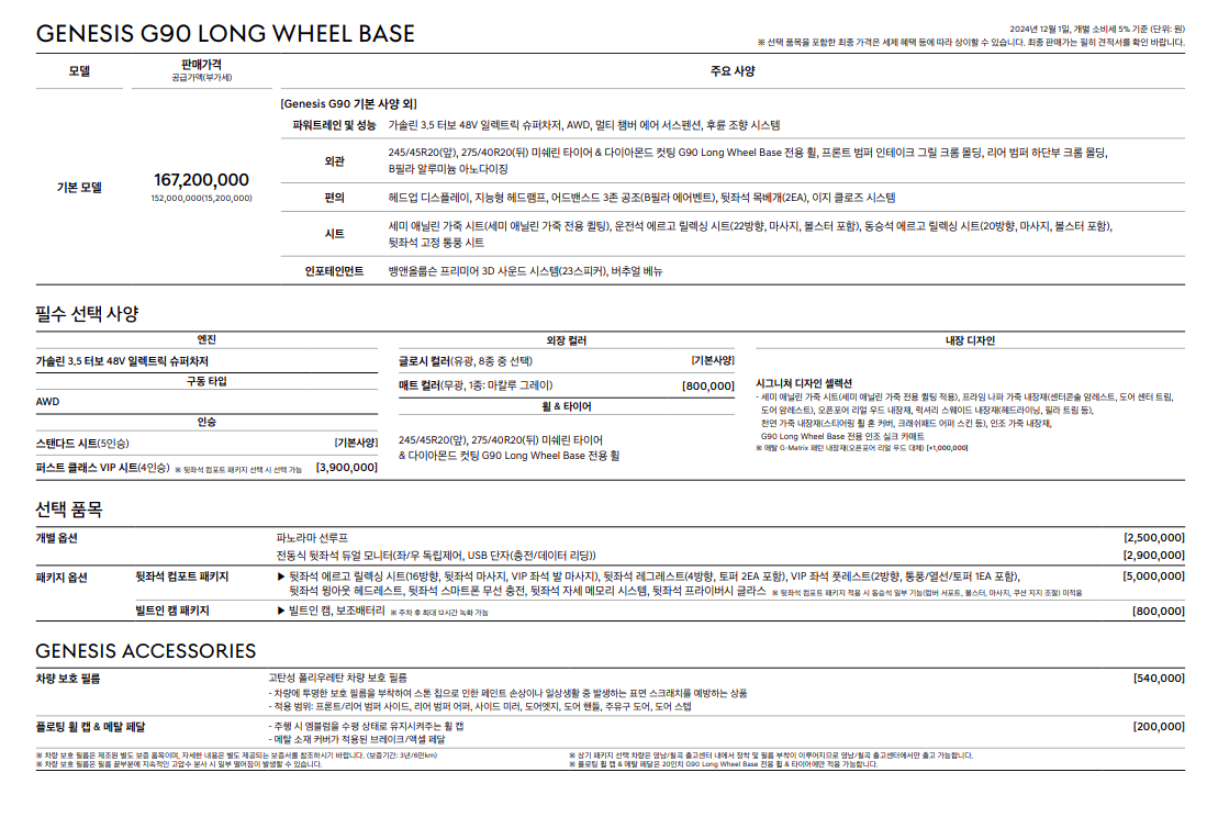 2025 제네시스 G90 가격표 알려드리겠습니다. 제네시스 G90은 고급 대형 세단으로, 뛰어난 성능, 첨단 기술, 세련된 디자인으로 주목받고 있습니다. 주요 사양과 특징은 다음과 같습니다.